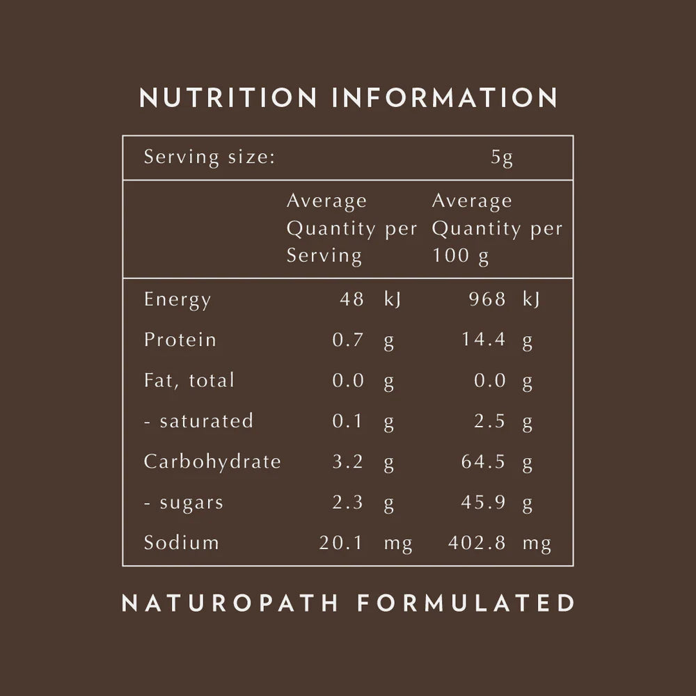 Ingredients: Organic Ceremonial Grade Matcha Tea, maple sugar, vanilla bean powder, Himalayan rock salt.