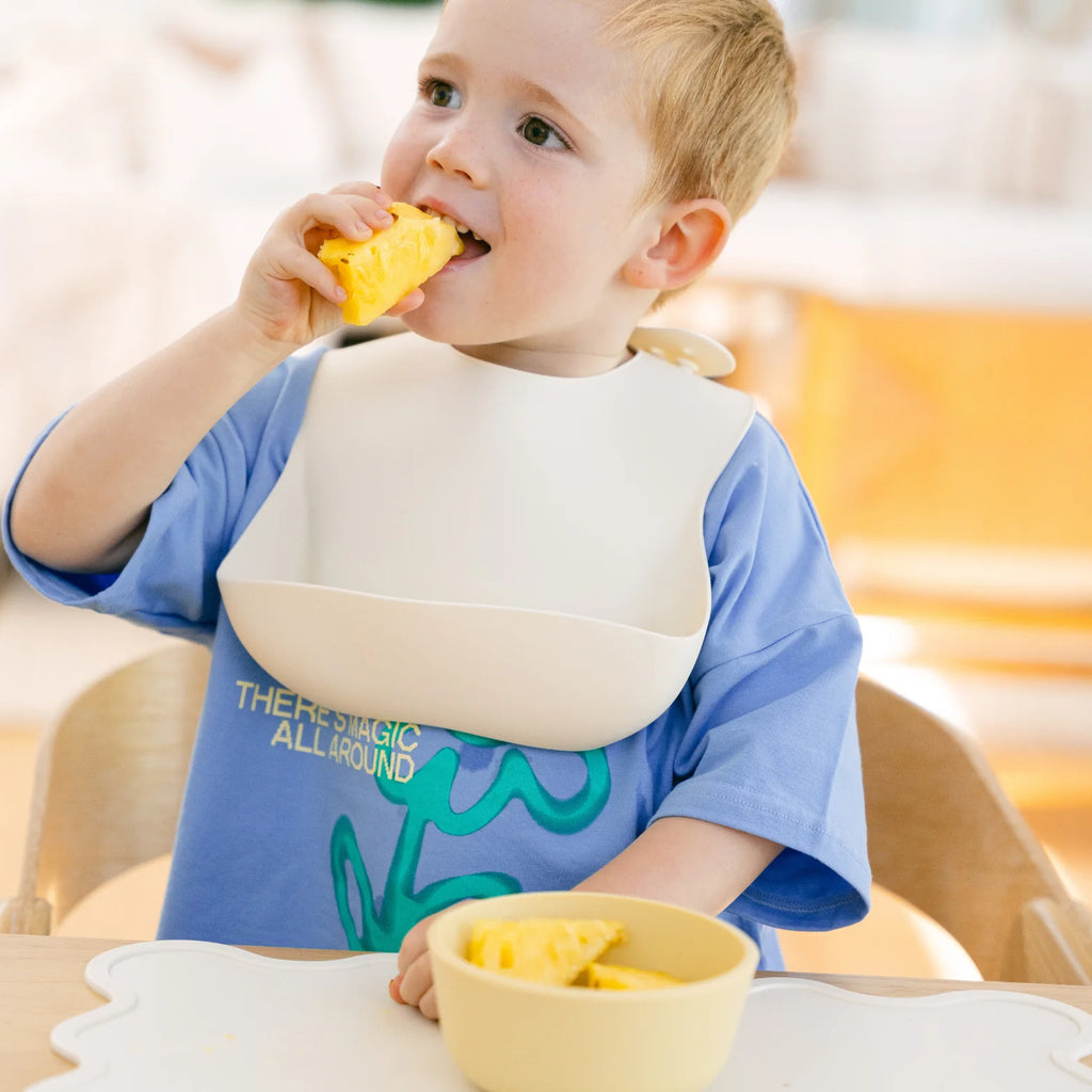 Rommer's silicone bib features a deep scoop pocket to catch crumbs and drips. Soft, yet durable, with reinforced button holes for a secure, adjustable fit from baby to toddler. Use on its own, or layer over a coordinating smock bib for extra coverage during extra messy moments.