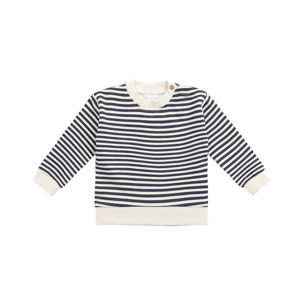 A timeless and cozy essential, the Peyton Sweatshirt in Slim Stripe Charter/Cloud features a classic horizontal stripe pattern in navy and white. With ribbed cuffs, hem, and neckline in solid white, plus a small button detail at the shoulder, this sweatshirt offers both comfort and style—perfect for layering on cooler days.