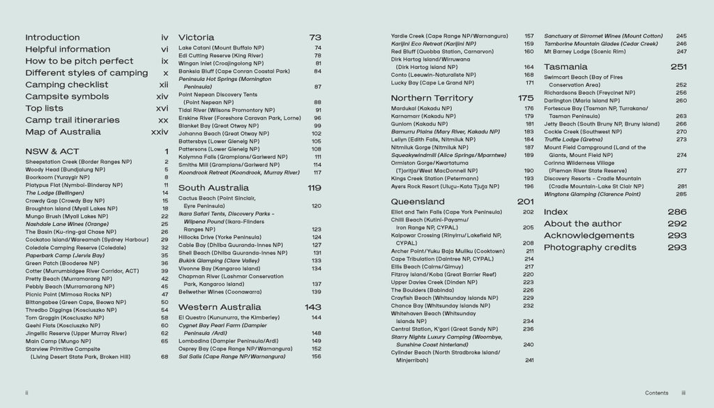 Each state-by-state chapter in Ultimate Campsites Australia 2nd edition contains detailed maps and the what-when-why-where information about each campground, alongside tips and anecdotes about the surrounding regions. You’ll find special sections dedicated to remote-island campgrounds, as well as sites with great walks and places close by to First Nations cultural experiences. There are also quick and easy lists for camping with pets, free camping, 4WD access and commercial campgrounds, and handy camping trail itineraries for when you want to tick off two or three campgrounds in one trip.
