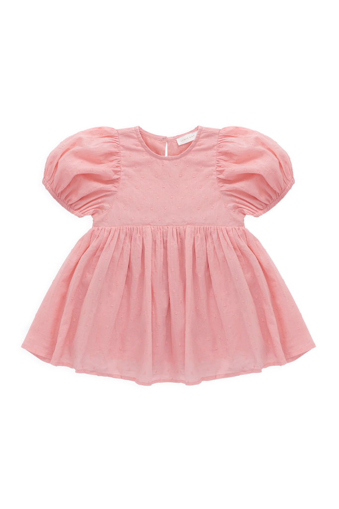 The Frannie Dress in our beautiful Swiss Pink hue is a timeless piece designed for comfort and elegance. Featuring puffed short sleeves, a softly gathered bodice, and a flowing skirt, this dress is perfect for warm days and special occasions. The subtle Swiss dot texture adds an extra touch of charm to this gorgeous design.