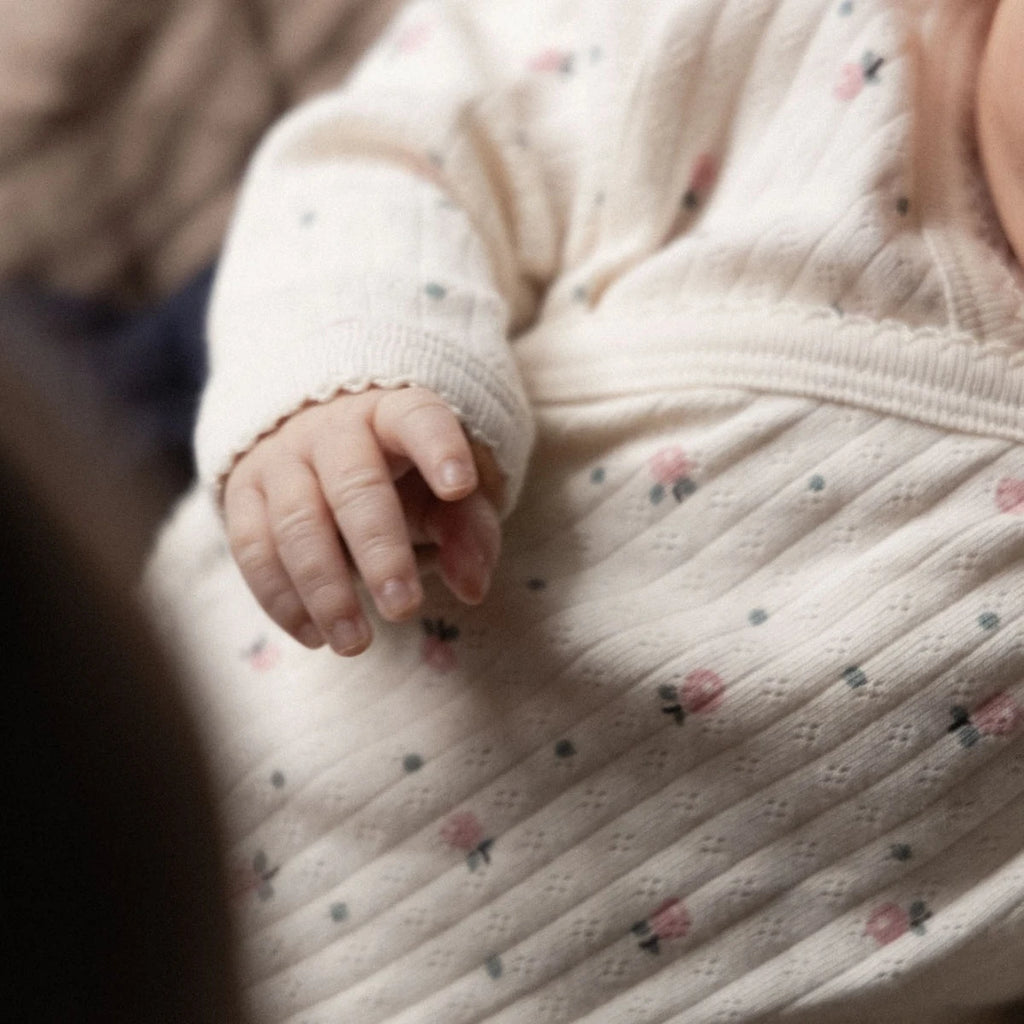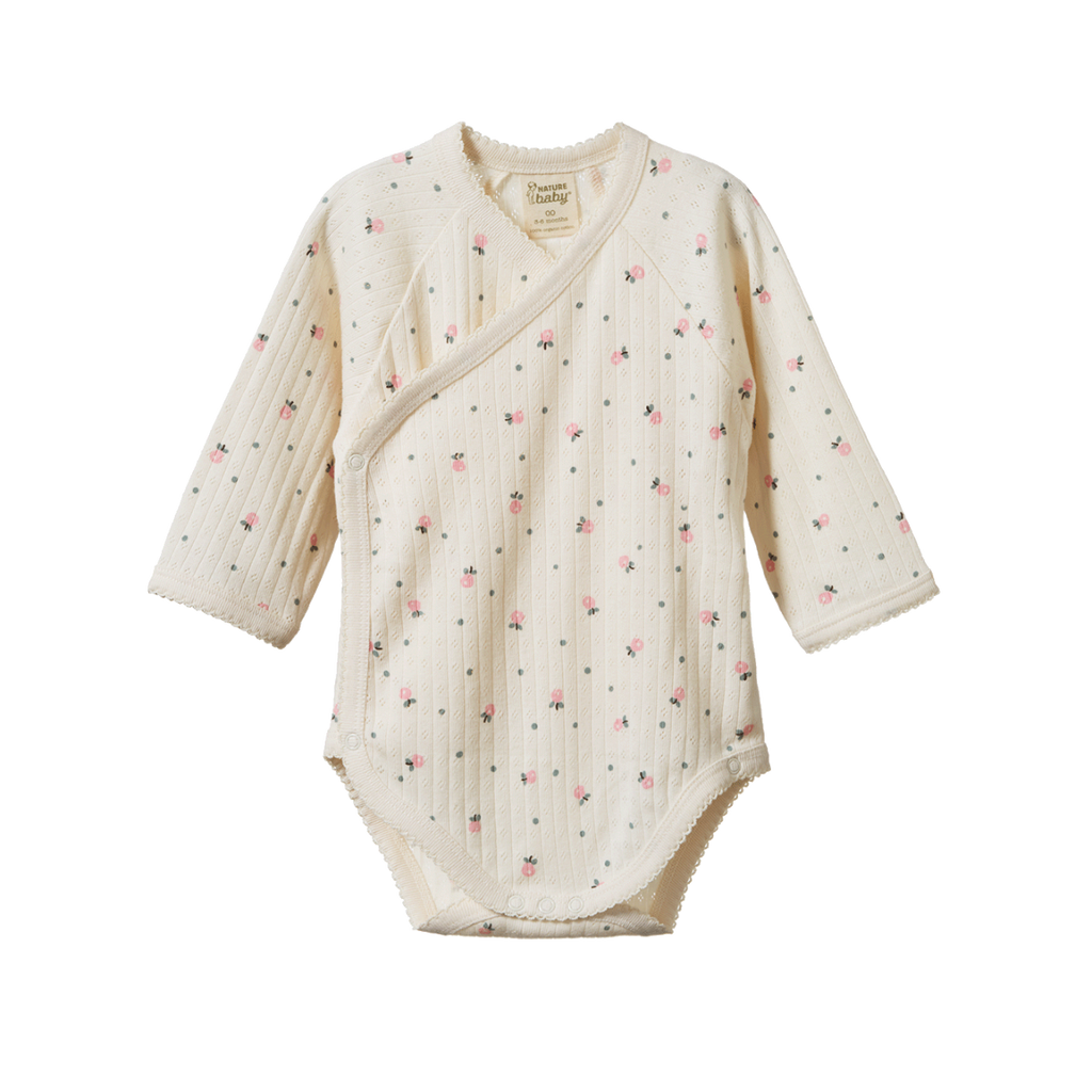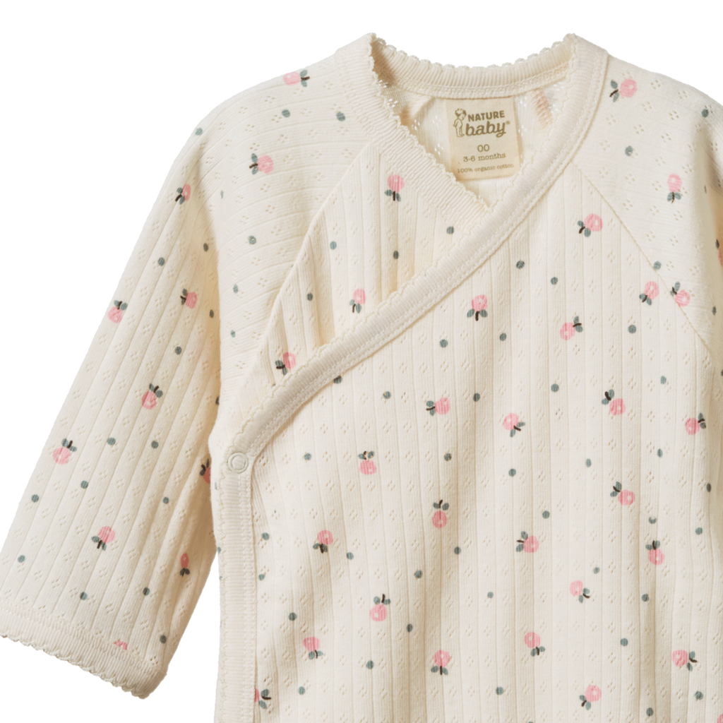 A great option for newborns to avoid having to pull garments over baby's head. Long raglan sleeves and a wrap-around style with a double layer at the front to keep baby’s chest warm. Easy to fasten with domes on the inside and outside, as well as the crotch and outside leg. Made from beautiful Pointelle fabric that's super soft and stretchy, featuring a delicate nostalgic knit pattern. To minimise shrinkage, this fabric has been pre-washed.