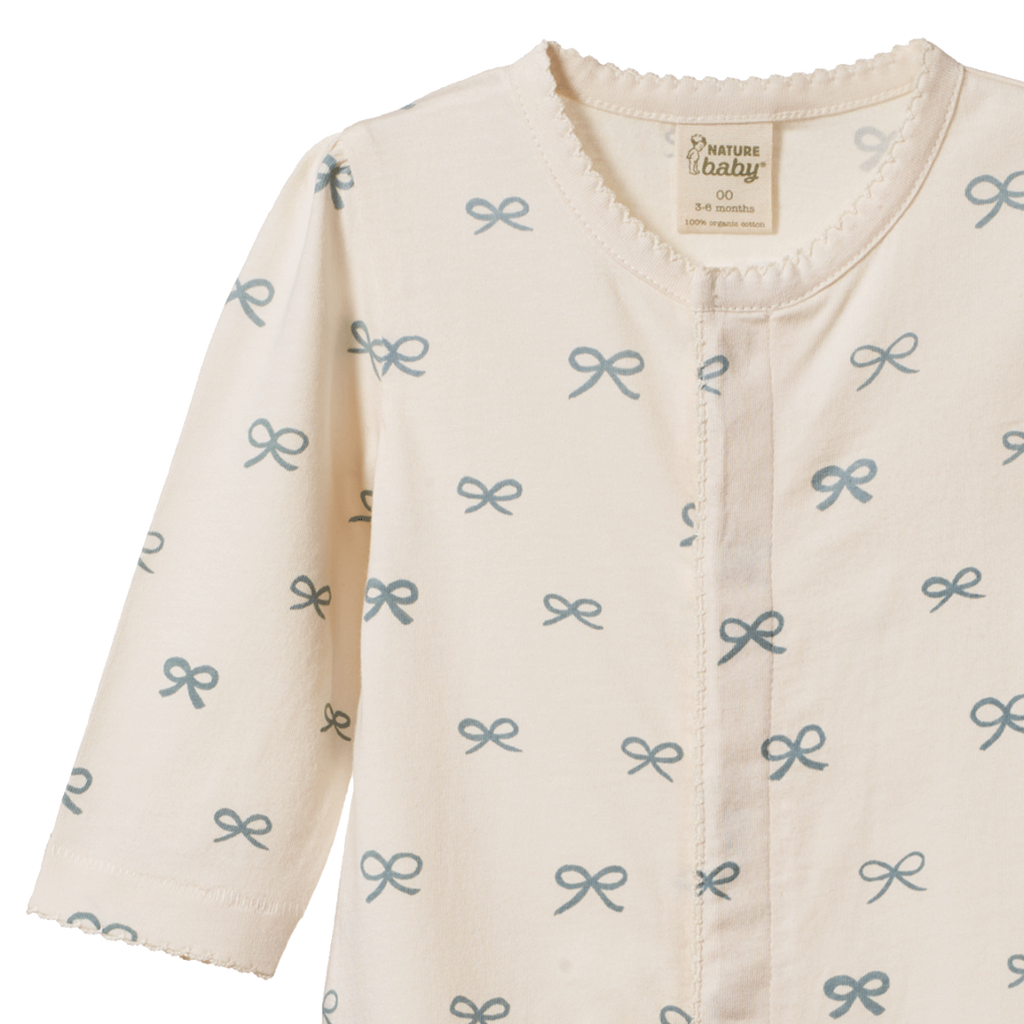 A sweet feminine version of our much loved Stretch and Grow. Our Lucy suit is made from soft organic cotton jersey and features beautiful gathering at the top of the sleeves , delicate picot stitching and hidden domes top open. To minimise shrinkage, this fabric has been pre-washed.