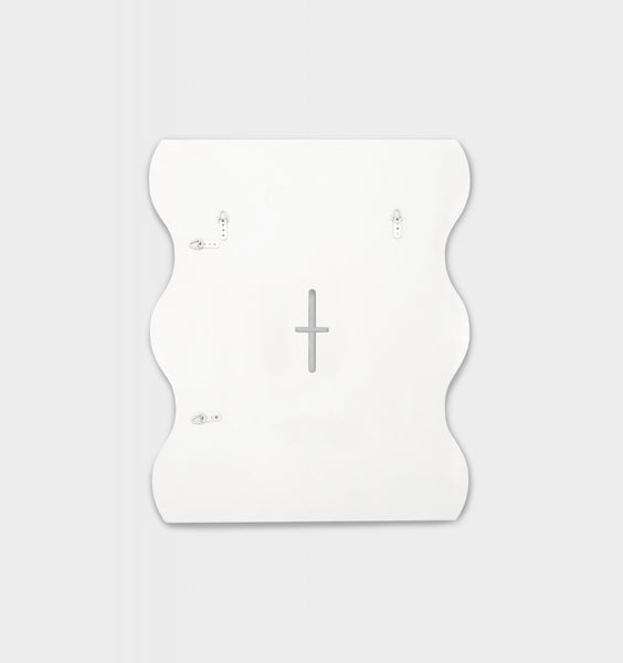 Mirrored glass, painted engineered wood frame, engineered wood backing.